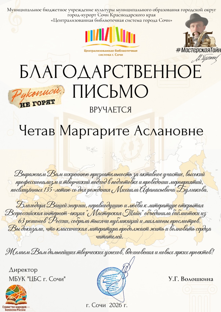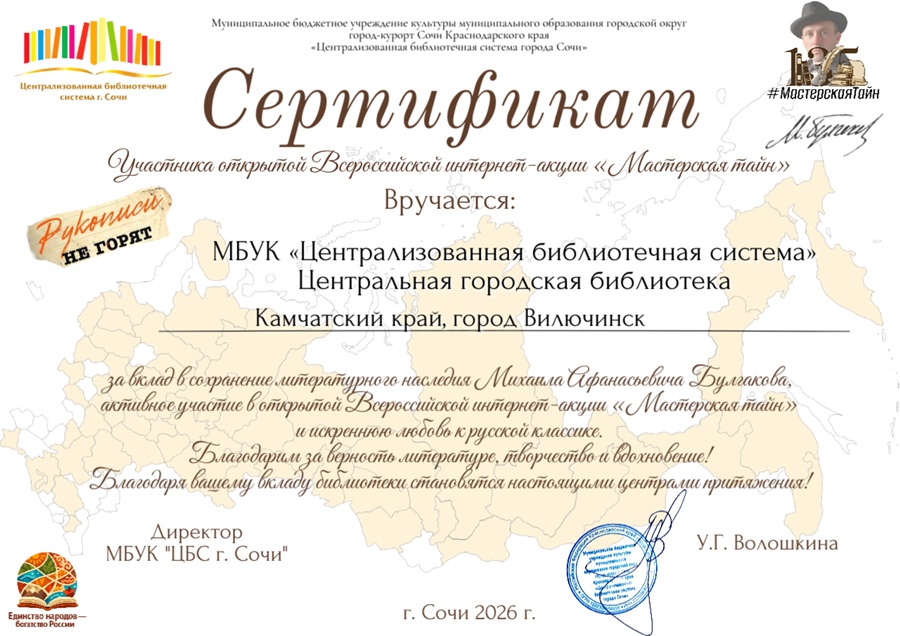 Центральная городская библиотека приняла участие во Всероссийской акции «Мастерская тайн», организованной Центральной городской библиотекой города‑курорта Сочи. В честь 135‑летия со дня рождения Михаила Афанасьевича Булгакова наша библиотека присоединилась к открытой интернет‑акции, которая проходила в социальной сети «ВКонтакте». Организаторы предоставили участникам полную свободу творческого проявления: каждый желающий мог выбрать формат своего материала. Главное требование к публикациям — упомянуть хэштег #МастерскаяТайн. Специалист библиотеки Маргарита Аслановна Четав, проявив творческую смекалку, создала информационный пост с цитатами из произведений Михаила Булгакова: «Мастер и Маргарита», «Белая гвардия», «Собачье сердце» и разместила его на официальной странице библиотеки в «ВКонтакте». По итогам акции специалист и Центральная городская библиотека получили именные сертификаты участника. Акция собрала: • 252 библиотеки из 63 регионов России – от Луганской Народной Республики до Камчатки; Эти цифры показывают, насколько творчество Михаила Булгакова близко и дорого тысячам читателей России. Для нас было большой честью поучаствовать в этом масштабном мероприятии. Акция действительно объединила множество регионов. И Камчатский край стал частью этого культурного события!