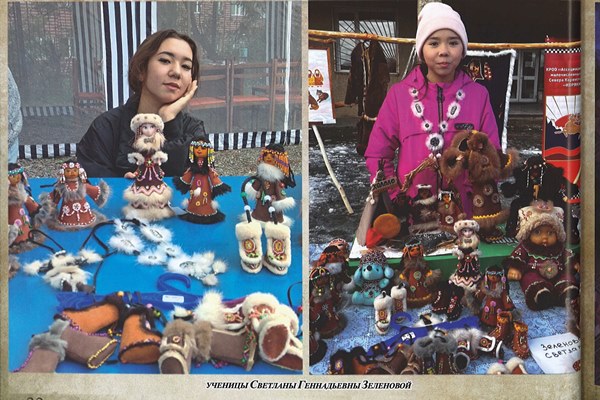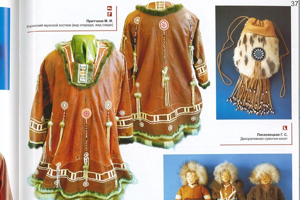 На страницах альбома соседствуют работы признанных мэтров и юных дарований. Это вселяет надежду и радость: древние обычаи обретают новую жизнь в творчестве потомков. Молодые художники, словно ловя нить из прошлого, с увлечением осваивают искусство вышивки бисером, а мастера из разных уголков Корякского округа постигают тонкости косторезного ремесла, впуская жизнь в застывшую кость. Перелистывая страницы альбома, не получится забыть тех, чья преданность и самоотверженный труд внесли неоценимый вклад в сохранение культуры региона. Среди них – Фёдор Дьяков и Маргарита Белова. Именно они рассказали о выдающихся мастерицах из национальных сёл Камчатки, которые сейчас с гордостью носят звание членов Союза художников России: Ольге Константиновне Олелей; Ямне Апельковне Тнельхут-Хаилино; Анне Павловне Тюменцовой; Евдокии Трофимовне Уваровой; Дарье Павловне Уваровой; Александре Ивановне Поповой; Марии Иннокентьевне Притчиной; Татьяне Николаевне Голиковой; Марии Иннокентьевне Чечулиной; Наталье Ивановне Эвгур. Их имена вписаны в летопись Корякского округа. То, что создали эти мастерицы – яркое выражение таланта, глубоких познаний родной культуры. Их произведения, словно послания из глубины веков, хранятся в фондах российских и зарубежных хранилищ, а также в частных коллекциях, восхищая своей красотой и самобытностью. Разнообразие народного искусства раскрывается в самых разных формах, поражая воображение: роспись нитями и бисером, словно россыпь драгоценных камней; меховая мозаика, где каждый кусочек – часть большой истории; макраме, хранящее тепло летнего солнца; вещи из рыбьей кожи и птичьих лапок, воплощающие мудрость и изобретательность предков; берестяная аппликация, дышащая ароматом леса; национальные куклы, бережно хранящие дух народа. Резчики по кости демонстрируют многовековой опыт работы с деревом, костью и металлом. Они воссоздают предметы обихода кочевников: орудия труда, оленьи и собачьи нарты, деревянные баты, пареньские ножи и многое другое. Женщины бережно хранят традиционные методы обработки кожи, кроя, украшения изделий, превращая их в уникальные произведения народного творчества. Особого внимания заслуживает традиционный костюм, созданный руками умелиц, в нём удивительным образом сочетаются эстетика и функциональность. Одежда из оленьих шкур, меховые шапки, сапоги из шкуры оленя, варежки, тапочки, зимние и летние штаны – каждый предмет, словно живая страница истории, несёт в себе отпечаток мастерства и любви к своему делу. Каждый орнамент – это символ, передающий сведения о тундре и её кочевых народах. В узоре, словно в зеркале, отражаются эстетические предпочтения, мастерство и неповторимая личность создателя. Традиционное искусство продолжает развиваться как в работах прославленных мастеров, так и их юных последователях. В учреждениях культуры и образования работают студии, секции и клубы по интересам, которые занимаются популяризацией народного творчества. Это позволяет передавать бесценный опыт из поколения в поколение, бережно храня живую нить традиций и не давая ей оборваться. [Узоры мастеров Корякии: к 90-летию Корякского округа / автор-составитель И. Н. Точилина ; составитель, ответственный за выпуск О. Н. Хамидулина]. – Петропавловск-Камчатский : [б. и.], 2023. – 101, [1] c. : цв. ил. ; 30 см. Хранен