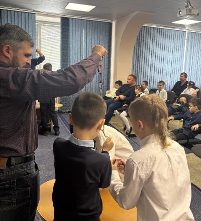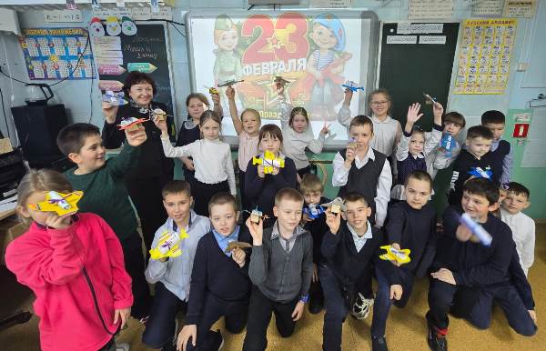 Для младших школьников библиотекарь Людмила Борисовна Лобанова провела познавательно-творческие часы, где рассказала о подвигах солдат и офицеров, совершённых при защите своей Родины. Во время беседы дети сделали подарок для своих пап: самолёт с добрыми пожеланиями.