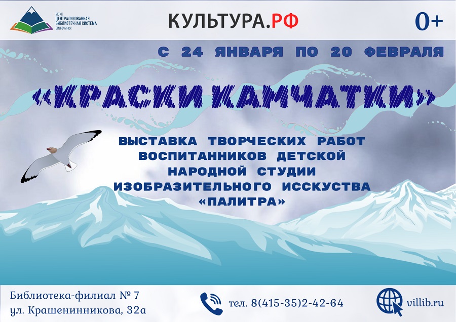 В январе была организована выставка «Краски Камчатки», где представлены работы воспитанников Народной студии изобразительного искусства «Палитра». Дети с любовью и вдохновением изобразили красоту родного края. Выставка представляет собой путешествие по живописным ландшафтам полуострова глазами детей.