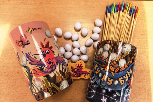 «Ку-ку-Бум» – тишина перед обвалом, или искусство баланса. Кукушке Кики пора высиживать птенцов, но все гнёзда вокруг, к сожалению, заняты. Что же ей делать, ведь она совсем не умеет строить? Постройте крепкое гнездо из палочек, куда можно аккуратно положить яйца, а затем усадить и саму кукушку. Это игра на ловкость, смекалку и чувство равновесия. Отлично тренирует ловкость рук, координацию движений, терпение и аккуратность. Идеальна для детей, обожающих игры на ловкость, рекомендуется и для всей семьи, которая хочет провести время за увлекательным занятием. Для детей от 6 лет