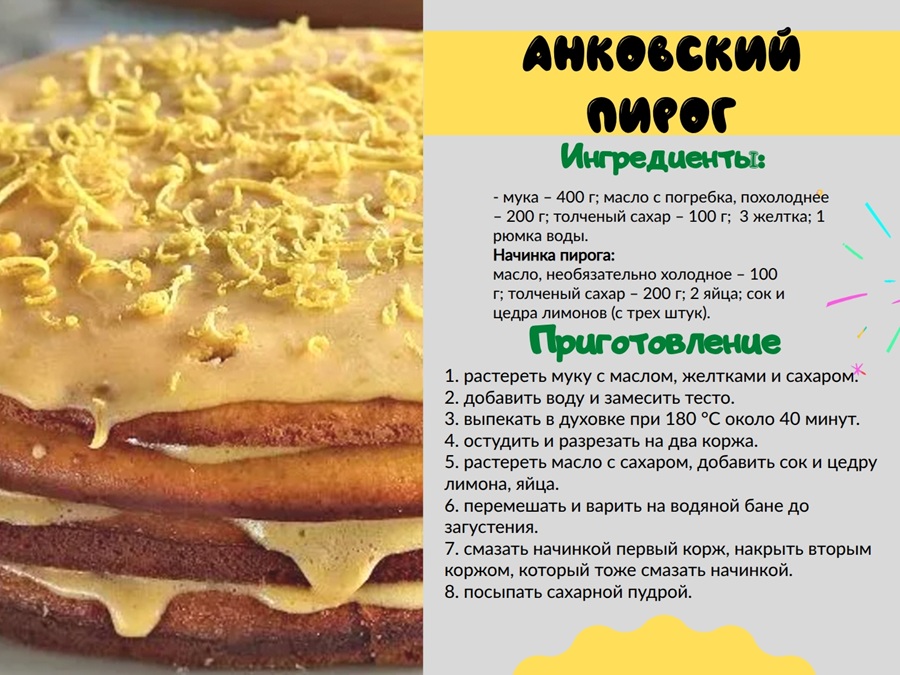 Лев Николаевич Толстой: Учитывая страсть графа Толстого к здоровому питанию и народной кухне, можно предположить, что его стол изобиловал бы овощными блюдами, разнообразными кашами и хлебом из цельнозерновой муки. Для создания праздничной атмосферы он бы выбрал запеченную утку с яблоками и домашний квас. Однако, поистине сакральным угощением в Ясной Поляне был «анковский пирог», известный также как «пирог Анке». Его история началась с домашнего врача семьи Толстых, Николая Анке, который поделился рецептом с тещей графа, Любовью Берс. От нее рецепт перешел к дочери, Софье Толстой, которая, в свою очередь, научила готовить этот пирог с толченым сахаром и лимонами повара Николая. Значимость этого блюда подчеркивает высказывание сына Толстого, Ильи, который сравнивал именины без «анковского пирога» с Рождеством без елки.