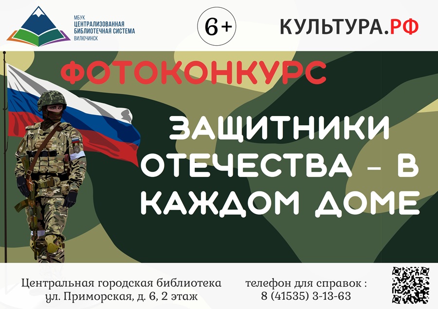 С 10 по 24 февраля Центральная городская библиотека приглашает детей и взрослых читателей с детьми принять участие в онлайн фотоконкурсе «Защитники Отечества – в каждом доме». Участие в конкурсе – это возможность укрепление семейных ценностей, популяризация образа защитника Отечества, развитие творческих активностей жителей города. На конкурс предоставляется одна фотография в электронном виде, на которой изображён папа, брат, дедушка или семейное фото с героем. Необходимо написать 2-4 предложения о своем герое. Конкурсные работы принимаются на сайте библиотеки в разделе «Конкурсы» заполнив Яндекс формы.