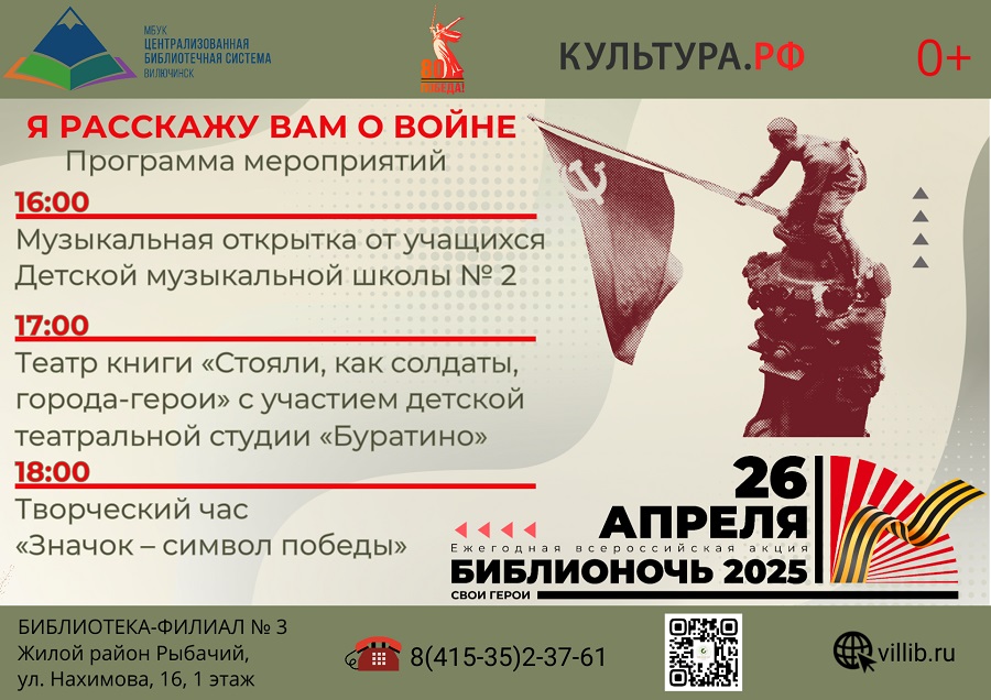26 апреля с 16:00 до 19:00 в детской библиотеке-филиале № 3 состоятся мероприятия в рамках ежегодной всероссийской акции «Библионочь». 2025 год объявлен в России Годом защитника Отечества. Все библиотеки страны в этот вечер станут площадками, где будут вспоминать и славить героев. Участников Библиосумерек ждет увлекательное путешествие в мир героизма и отваги. В программе: