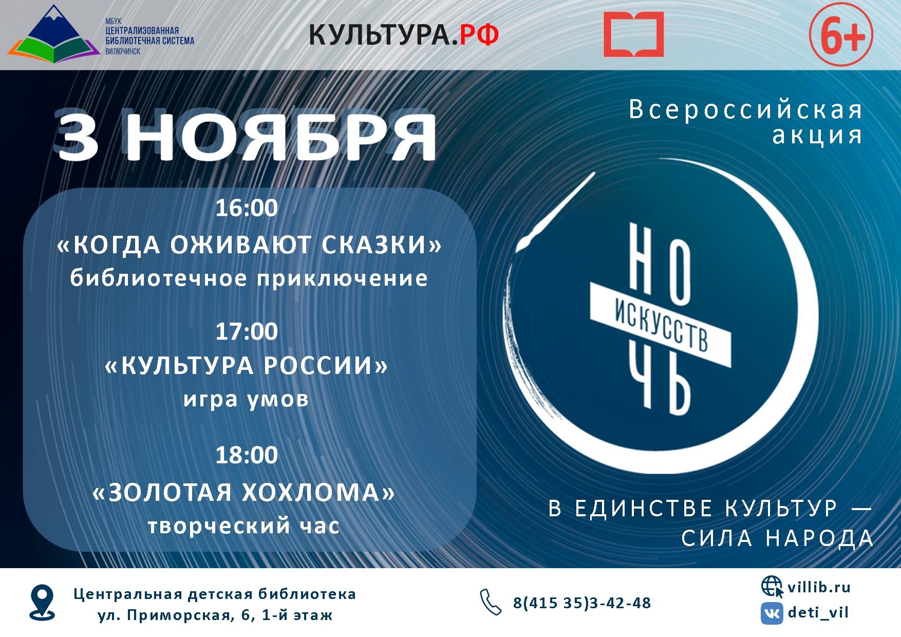 3 ноября с 16:00 до 19:00 сотрудники Центральной детской библиотеки приглашают юных вилючинцев и их родителей принять участие в программе «Когда оживают сказки» в рамках ежегодной всероссийской акции «Ночь искусств – 2025». В 16:00 начнётся библиотечное приключение с Незнайкой, поэтом Цветиком и художницей Кисточкой. Помимо представления, гостей ждут игры «Загадки в картинах», «Рифмоплет», много музыки, песен и стихов. В 17:00 начнётся игра умов «Культура России». Это интеллектуальное состязание, где участники смогут проверить и расширить свои знания о культурном наследии страны. В ходе игры ребятам предстоит погрузиться в удивительный мир народных традиций и обычаев. В 18:00 откроется творческая мастерская. Гости познакомятся с художественной росписью народов России и самостоятельно создадут узоры в стиле хохломской росписи в технике пластилинографии. У гостей старшего возраста будет возможность нанести на деревянный спил акриловыми красками изображение мифической райской птицы. Час творчества пройдет под руководством преподавателя Детской художественной школы Анны Витальевны Витковской. Адрес Центральной детской библиотеки: ул. Приморская, 6, 1 этаж. ☎ для справок: 8(41535)3-42-48