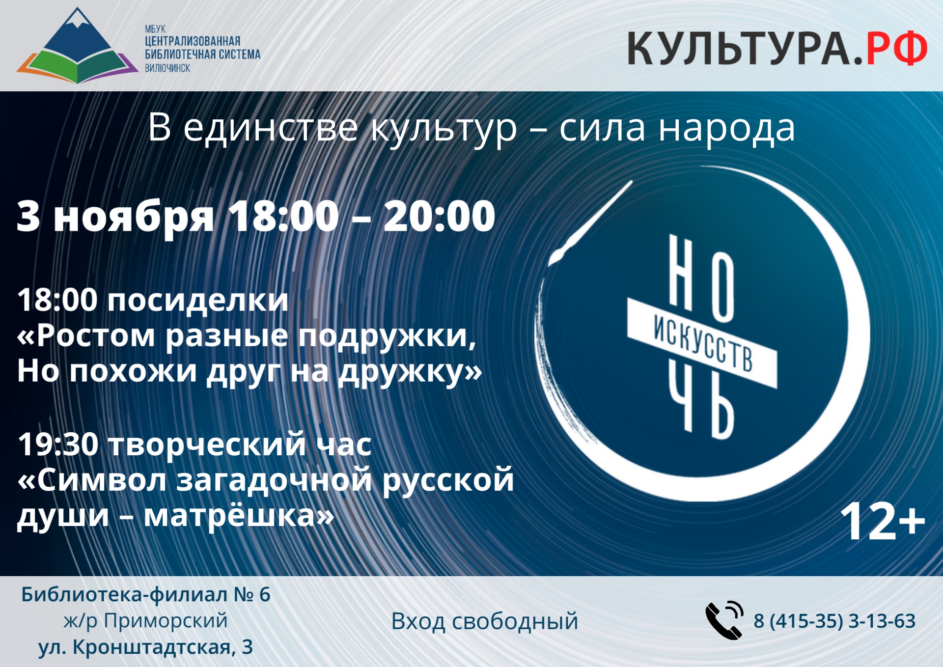 3 ноября с 18:00 до 20:00 библиотека-филиал № 6 приглашает горожан среднего и старшего возраста принять участие в мероприятиях в рамках Всероссийской культурной акции «Ночь искусств». Программа будет посвящена русской матрёшке – игрушке, известной всем детям России. Это и кукла, и сувенир, который увозят на память иностранцы, и произведение народного творчества. Матрёшка стала одним из символов России. Кажется, что она была всегда, но на самом деле ей совсем немного лет: чуть больше ста. Историю появления матрешки, её «родственников» в России и за рубежом, виды росписи и многое другое узнают гости библиотеки на посиделках за чашкой чая. Далее примут участие в творческом часе и сделают аппликацию с этими милыми русскими куклами. Адрес библиотеки-филиала № 6: ул. Кронштадтская, д. 3 ☎ для справок: 8 (415-35) 3-13-63