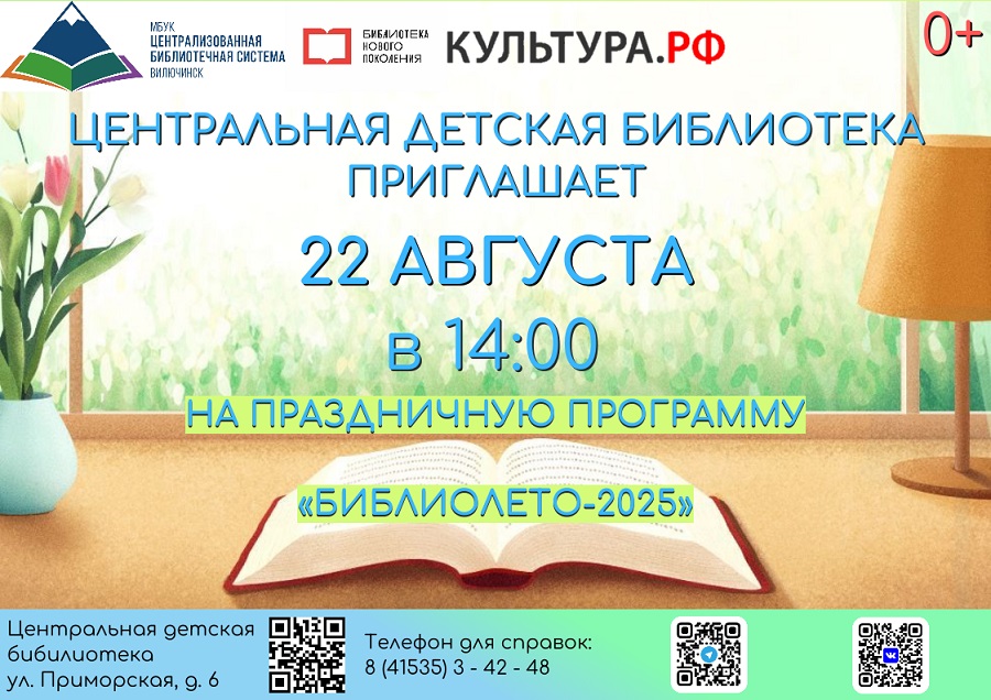 22 августа в 14 часов в Центральной детской библиотеке состоится мероприятие, посвященное награждению лучших читателей лета-2025. Участников ждет встреча с Мери Поппинс. Вместе отправимся в увлекательное путешествие по сказкам и литературным произведениям. Ребята смогут продемонстрировать свои знания, смекалку и любовь к книгам, а также весело провести время в компании сверстников. Народный театр куклы и юного актера «Волшебники» представят театрализованное представление. Мероприятие завершится торжественной церемониинаграждения лучших читателей лета-2025. Ребята, проявившие наибольшую активность в чтении и посещении библиотеки, получат заслуженные награды – грамоты и подарки. Ждем вас по адресу: ул. Приморская, 6. Справки по телефону: 8(41535)3-42-48