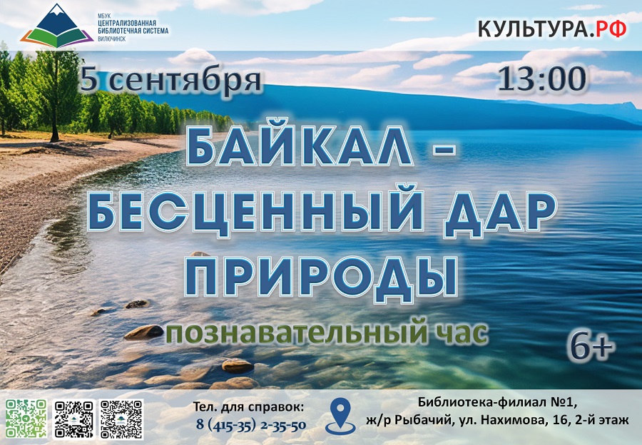 Мероприятие будет интересно как детям, так и взрослым. Приходите всей семьёй, чтобы узнать новые факты о жемчужине Сибири! Адрес библиотеки-филиала № 1: ул. Нахимова, 16, 2-й этаж. ☎ для справок: 8(415-35)2-35-50.