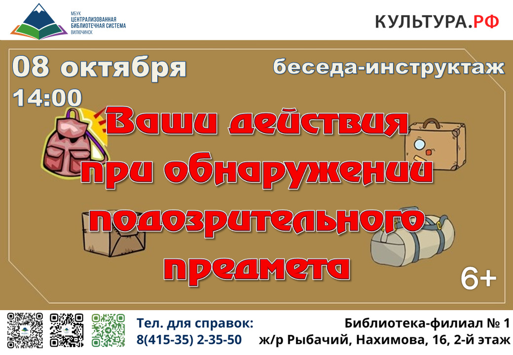 08 октября в 14:00 в библиотеке-филиале № 1 пройдёт беседа-инструктаж «Ваши действия при обнаружении подозрительного предмета». Мероприятие проводится в рамках профилактики терроризма и экстремизма и посвящено правилам поведения в случае обнаружения подозрительных предметов – забытые вещи, бесхозные предметы или посылки. Беседа научит правильно действовать в такой ситуации и избежать возможных угроз безопасности. Сотрудники библиотеки расскажут о том, как важно проявлять гражданскую бдительность. Книжная выставка «Будь бдителен!» представит издания, содержащие информацию о правилах безопасности. В конце мероприятия участникам раздадут информационные памятки на эту тему. Адрес: жилой район Рыбачий, ул. Нахимова 16, 2 этаж