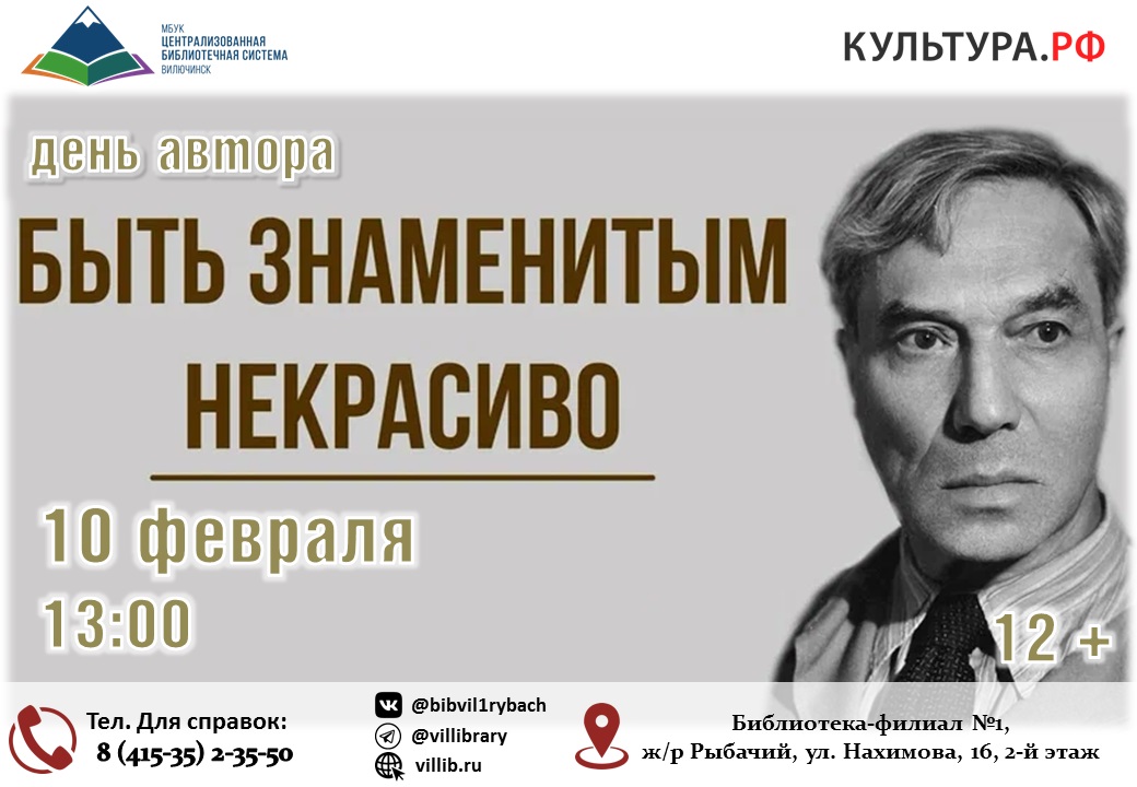03 февраля в 13:00* сотрудники библиотеки-филиала № 1 приглашают жителей города познакомиться с биографией и творчеством российского писателя Бориса Леонидовича Пастернака, которому в 2025 году исполняется 135 лет со дня рождения. Ведущие расскажут участникам мероприятия о жизни писателя и поэта, родившегося в эпоху великих преобразований, революций и технического прогресса. О том, что жизнь в царской, а потом в советской России, революция и две мировые войны не могли не отразиться на его творчестве. В ходе мероприятия участники познакомятся с книгами Бориса Пастернака из фонда библиотеки. *Возможно изменение даты и времени проведения мероприятия. За информацией обращайтесь к организаторам. Адрес библиотеки-филиала № 1: ул. Нахимова, 16, 2-й этаж. ☎ для справок: 8(415-35)2-35-50.