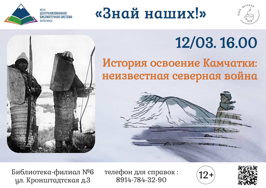 12 марта в 16:00 сотрудник библиотеки-филиала № 6 приглашает на мероприятие «Знай наших!», посвящённый истории освоения Камчатки. Краевед-любитель Людмила Васильевна Мирзоян проведёт увлекательный экскурс по страницам книг знаменитых исследователей Камчатки: Карла фон Дитмара, Георга Вильгельма Стеллера и Кирилла Тимофеевича Хлебникова. Адрес библиотека-филиал №6: ул. Кронштадтская, 3.