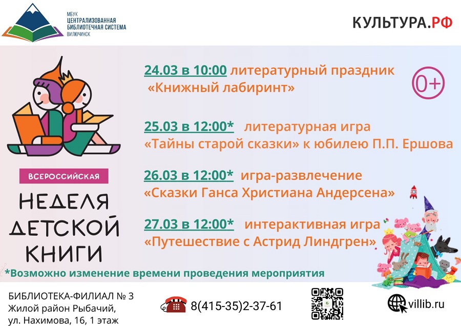 С 24 по 27 марта в детской библиотеке-филиале № 3 пройдет Неделя детской книги – ежегодное мероприятие, объединяющее как детей, так и взрослых – всех, кто любит читать. В течение недели ребят ждут игровые программы и познавательные часы. Цикл мероприятий откроет литературный праздник «Книжный лабиринт». Ведущие расскажут ребятам об истории Книжкиной недели, о писателях и книгах-юбилярах 2025 года. Участников мероприятия ждут веселые игры и конкурсы. 25 марта юные читатели попадут на литературную игру «Тайны старой сказки». Ребятам предстоит сыграть в познавательную игру и помочь героям в их путешествии. 26 марта гости библиотеки примут участие в игре-развлечении по сказкам Ганса Христиана Андерсена. Участников ждут вопросы познавательной викторины, а также поздравительные телеграммы от сказочных персонажей. 27 марта состоится интерактивная игра «Путешествие с Астрид Линдгрен». Ребята познакомятся с биографией и творчеством известного автора и выполнят различные игровые задания. Адрес библиотеки-филиала № 3: ул. Нахимова, 16, 1-й этаж. ☎ для справок: 8(415-35)2-37-61.