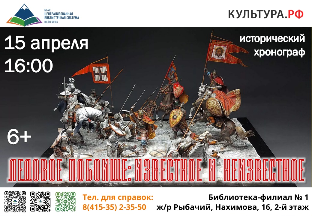 15 апреля в 16:00 библиотека-филиал № 1 приглашает принять участие в историческом хронографе «Ледовое побоище: известное и неизвестное». Библиотекари расскажут участникам мероприятия о документальных свидетельствах битвы, об исторических нестыковках в записях и о том, чем же так важно это событие для российского народа. На уроках истории в школе о Ледовом побоище обычно рассказывают одно и то же: как Александр Невский загнал противника на лёд Чудского озера, и тысячи немецких всадников под тяжестью доспехов утонули в озере. Однако многие представляют сражение скорее по знаменитому фильму Сергея Эйзенштейна «Александр Невский», а не по исследованиям историков. Адрес библиотеки-филиала № 1: ул. Нахимова 16, 2 этаж. ☎ для справок: 8 (415-35) 2-35-50.