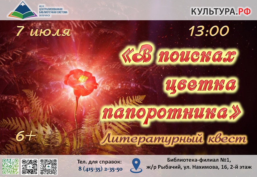 7 июля в 13:00 в библиотеке-филиале № 1 состоится литературный квест «В поисках цветка папоротника». Это мероприятие станет настоящим приключением для детей и их родителей! Библиотекарь расскажет ребятам о волшебной легенде, согласно которой в День Ивана Купала расцветает цветок папоротника. По преданию, тот, кто найдет этот цветок, обретает магические силы и находит клад. По мотивам услышанной легенды участники квеста отправятся в захватывающее путешествие на поиски цветущего папоротника. На пути к цели ребятам помогут добрые волшебники, которые укажут дальнейший путь, но для этого им предстоит выполнить различные задания и помочь волшебникам в их делах. Участникам нужно будет поломать голову над загадками, чтобы отыскать волшебников и собрать все подсказки. В завершение квеста, собрав все подсказки, команды получат от сказительницы письмо-кроссворд. Разгадав его, они найдут цветущий папоротник и, конечно же, клад-подарок! Адрес библиотеки-филиала № 1: ул. Нахимова, 16, 2 этаж. ☎ для справок: 8 (415-35)2-35-50.