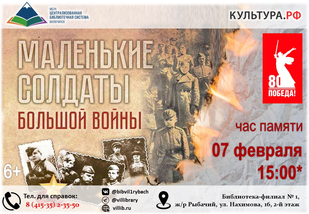 07 февраля в 15:00* библиотека-филиал № 1 приглашает жителей города на час памяти, посвящённый юным героям-антифашистам. В феврале во всем мире отмечают два установленных ООН праздника, связанных с детьми и подростками: День памяти юного героя-антифашиста и Международный день детей-солдат. Участники мероприятия узнают о юных патриотах, поднявшихся на борьбу с фашизмом не только на территории Советского Союза, но и в странах Европы. 8 февраля 1943 года были расстреляны пять мальчишек-парижан из лицея «Бюффон», не предавшие своих друзей-подпольщиков в годы Второй мировой войны. В этот же день в захваченном фашистами Краснодоне были расстреляны герои-молодогвардейцы Олег Кошевой, Любовь Шевцова, Дмитрий Огурцов, Виктор Субботин, Семен Остапенко. В 1964 году Ассамблея Организации Объединённых Наций утвердила 8 февраля Днём памяти юного героя-антифашиста. Мероприятие организовано в рамках программы работы по патриотическому воспитанию подростков и молодёжи. *Возможно изменение времени проведения мероприятия. Адрес библиотеки-филиала № 1: ул. Нахимова, 16, 2-й этаж. ☎ для справок: 8(415-35)2-35-50.