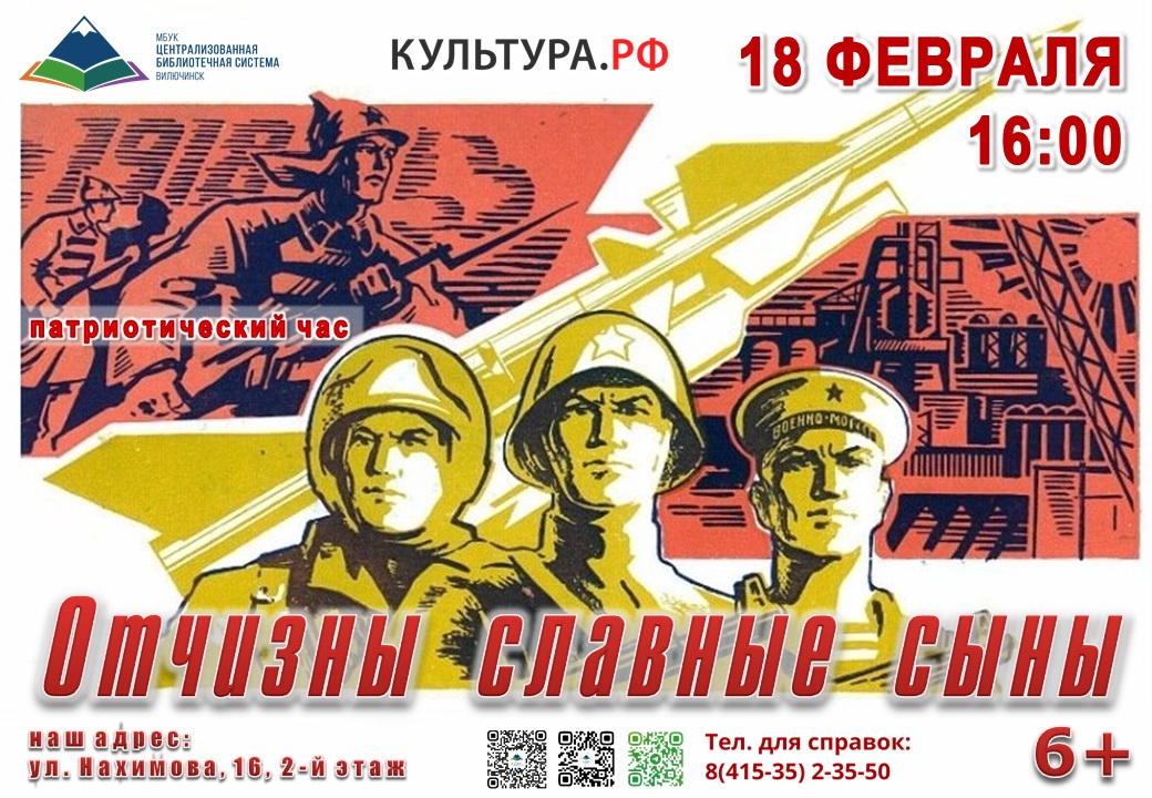 18 февраля в 16:00 библиотека-филиал № 1 приглашает на патриотический час «Отчизны славные сыны», посвящённый Дню защитника Отечества. В ходе истории нашего государства в народе сложился образ защитника родной земли: бесстрашного, горячо любящего родную землю воина, который готов отдать жизнь за Отечество. Сотрудники библиотеки предлагают вспомнить и почтить память героев – защитников Отечества в истории страны, родного края, города, семьи, познакомить с примерами героических поступков из разных исторических эпох России. Целью мероприятия является воспитание патриотического сознания на примере героических судеб соотечественников и создание в представлении участников исторически сложившегося образа защитника, достойного памяти и уважения потомков. Адрес библиотеки-филиала № 1: ул. Нахимова, 16, 2-й этаж. ☎ для справок: 8(415-35)2-35-50.
