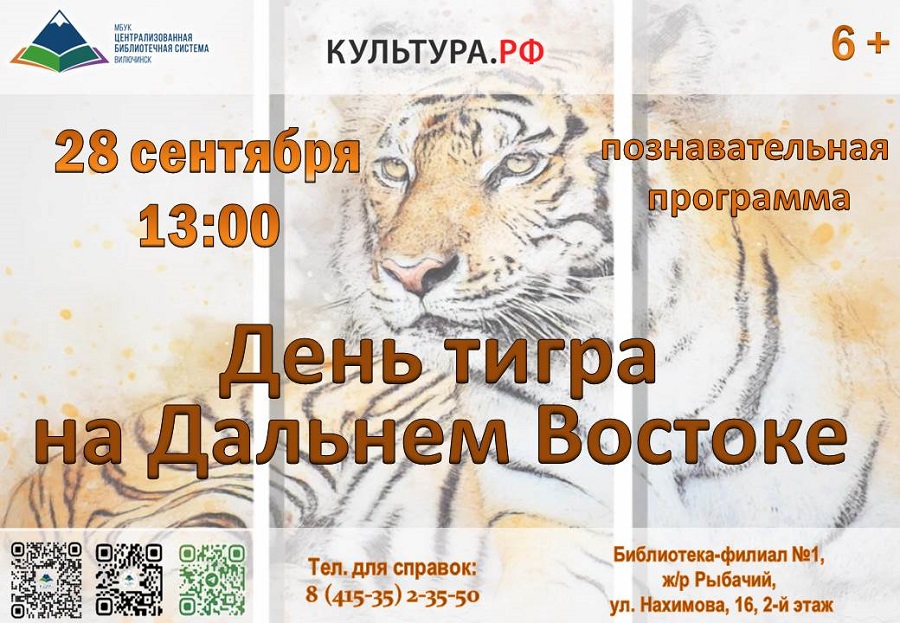28 сентября в 13:00 в библиотеке-филиале № 1 приглашает на познавательный час «День тигра на Дальнем Востоке», посвящённый хозяину тайги. В 2000 году экологи учредили День тигра на Дальнем Востоке. Этот праздник создан для привлечения внимания людей к проблеме сохранения благородного хищника из подсемейства больших кошек. Мероприятие будет интересно как детям, так и их родителям. Адрес библиотеки-филиала № 1: ул. Нахимова, 16, 2-й этаж.