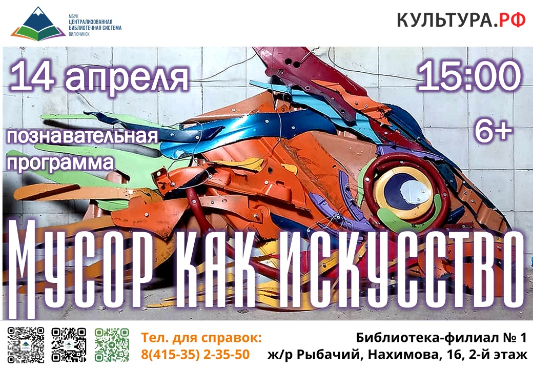 14 апреля в 15:00 библиотека-филиал № 1 приглашает всех желающих на познавательную программу «Мусор как искусство». Участники мероприятия познакомятся с нестандартно мыслящими художниками и их творениями, посвящёнными проблемам загрязнения окружающей среды и напоминающим об ответственности за будущее планеты. Разговор пойдёт об экологии в искусстве: о создании арт-объектов из мусора, что стало очень популярно в связи с обострившимися экологическими проблемами. Организаторы мероприятия расскажут о том, как люди разных стран активно используют для воплощения своих идей оригинальный материал – различный мусор. Программа направлена на популяризацию экологических знаний. Адрес библиотеки-филиала № 1: ул. Нахимова 16, 2 этаж. ☎ для справок: 8 (415-35) 2-35-50.
