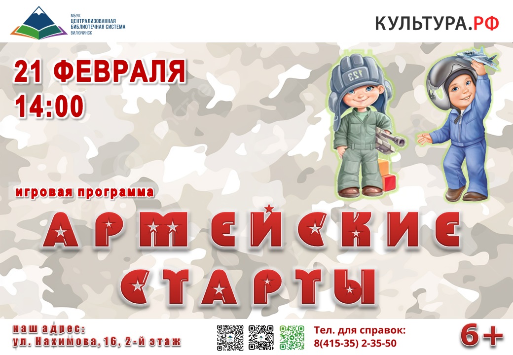 21 февраля в 14:00 библиотека-филиал № 1 приглашает на игровую программу «Армейские старты», посвящённую Дню защитника Отчества. День защитника Отечества – профессиональный праздник военных, которые со временем превратился в праздник всех мужчин. Ведущие мероприятия расскажут участникам мероприятия об истории праздника. Далее ребята примут участия в состязаниях и веселых конкурсах на скорость и ловкость, находчивость, быстроту реакции. В ходе игры вспомнят рода войск РФ, профессии военных, названия головных уборов военнослужащих, а также пословицы и поговорки о воинской доблести. В финале мероприятия команды будут награждены поощрительными призами. Мероприятие организовано с целью воспитания уважения к воинскому долгу и профессии военнослужащего. Адрес библиотеки-филиала № 1: ул. Нахимова, 16, 2-й этаж. ☎ для справок: 8(415-35)2-35-50.