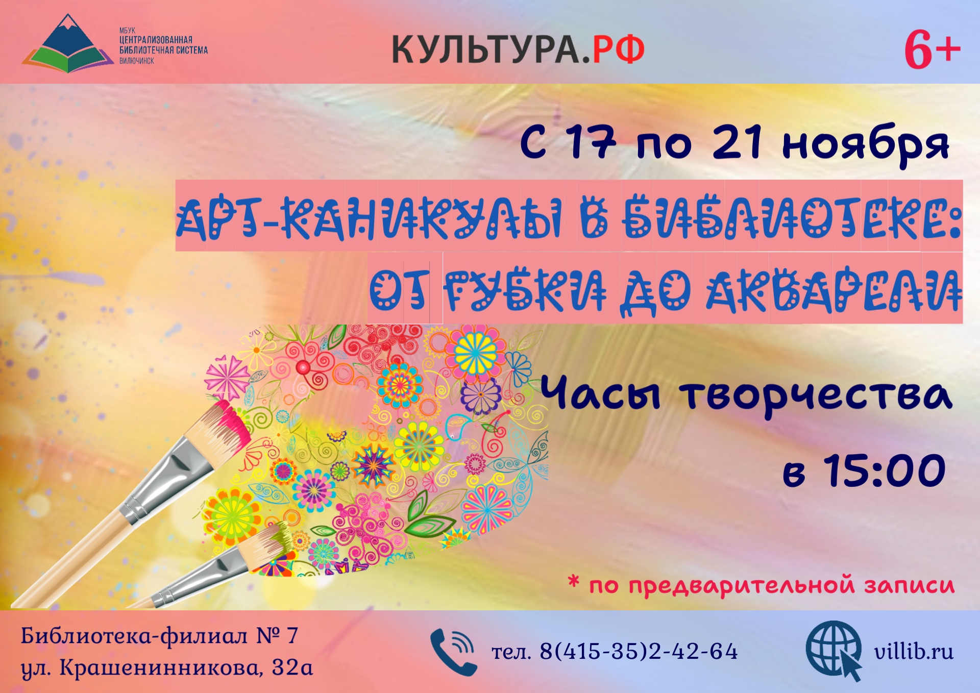 Для участия в мероприятиях необходимо записаться по телефону: 8(415-35) 2-42-64 Адрес библиотеки-филиала № 7: ул. Крашенинникова, 32А, пом. 21 Актуальная программа мероприятий библиотек города доступна в разделе «Афиши» | |