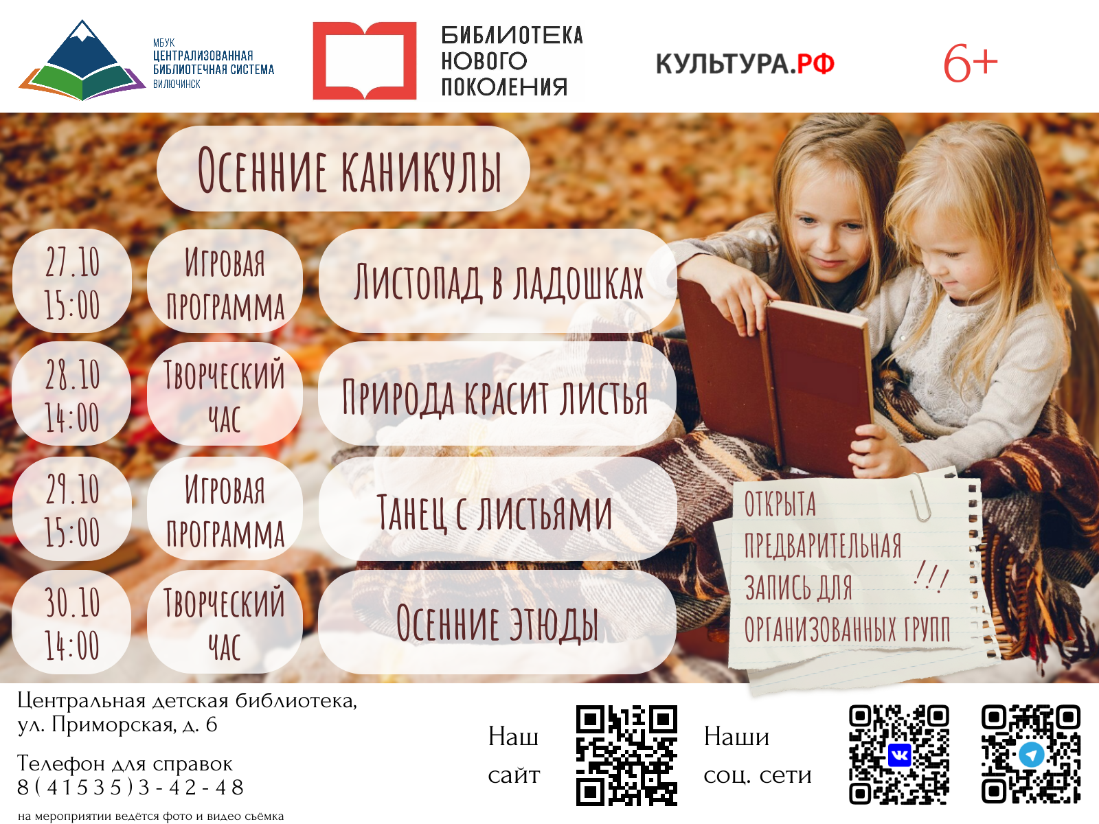 С 27 по 30 октября Центральная детская библиотека приглашает школьников весело, познавательно и творчески провести осенние каникулы. Для юных гостей сотрудники библиотеки подготовили мероприятия, посвященные осени. 27 октября в 15:00 состоится игровая программа «Листопад в ладошках». Гостей ждут веселые эстафеты с «осенними» атрибутами, загадки и викторина про осень. 28 октября в 14:00 пройдет творческий час «Природа красит листья». Вместе с библиотекарями дети создадут яркие поделки из природных материалов и познакомятся с необычными техниками рисования. Каждый листочек вдохновит участников на творчество и расскажет свою осеннюю историю. 29 октября в 15:00 игровая программа «Танец с листьями» позволит сполна насладиться красотой и атмосферой осени. Участников ждут танцевальные импровизации, игры на развитие координации и фантазии. 30 октября в 14:00 состоится творческий час «Осенние этюды». Гости узнают об осени как источнике вдохновения для художников и поэтов, послушают отрывки из стихотворений А. Фета, Ф. Тютчева, С. Есенина. Получив заряд вдохновения, каждый участник сможет создать собственный «осенний этюд» в любой технике. Адрес Центральной детской библиотеки: ул. Приморская, д. 6, 1 этаж. ☎ для справок: 8 (41535) 3-42-48