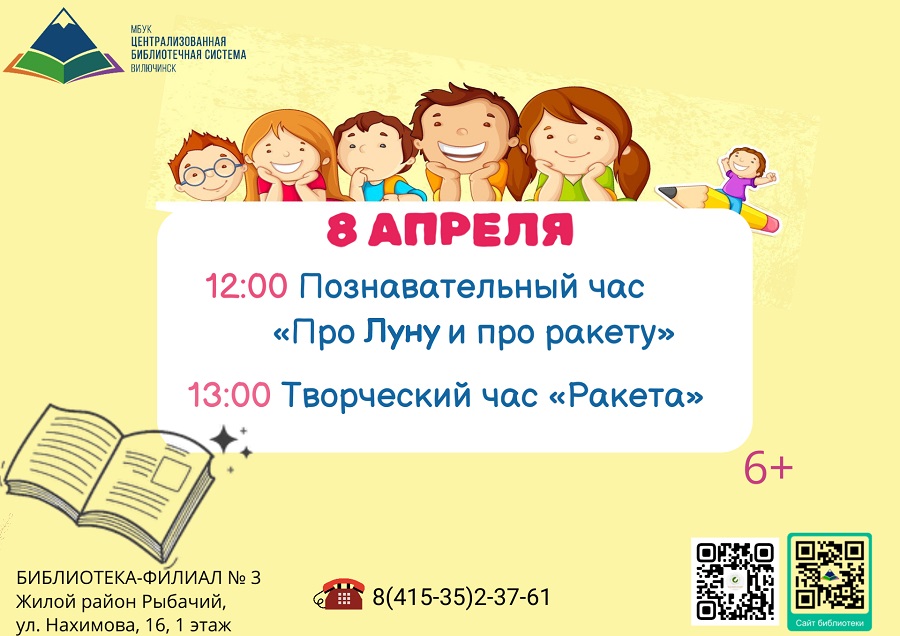 8 апреля в 12:00 и в 13:00 детская библиотека-филиал № 3 приглашает всех желающих принять участие в мероприятиях, посвященных Дню космонавтики. Участники познавательного часа «Про Луну и про ракету» узнают множество интересных фактов о нашем ближайшем космическом соседе – Луне. Откуда она взялась? Какие тайны скрывает её поверхность? Ребята познакомятся с историей освоения космоса, узнают о первых космонавтах и о том, как люди мечтали добраться до Луны. А также о строении ракеты; о том, как она взлетает и как преодолевает земное притяжение; о различных типах ракет и их применении в космических исследованиях. В 13:00 начнётся творческий час «Ракета». Это возможность дать волю своей фантазии и смастерить собственные ракеты из различных материалов: бумаги, картона и других. Каждый участник сможет проявить индивидуальность и украсить поделку по своему вкусу. Адрес библиотеки-филиала № 3: ул. Нахимова, 16, 1 этаж. ☎ для справок: 8(415-35)2-37-61.