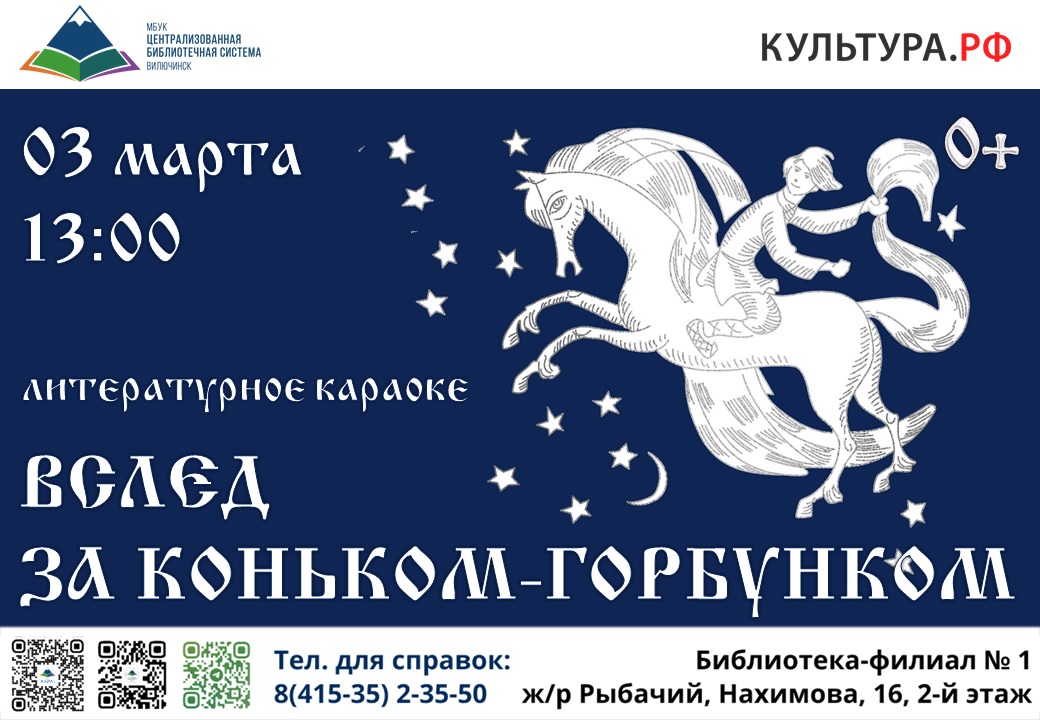 03 марта в 13:00 библиотека-филиал № 1 приглашает школьников на мероприятие в форме литературного караоке «Вслед за Коньком-Горбунком», посвященное 210-летию со дня рождения сказочника П.П. Ершова. Литературное караоке – это веселая игра, которая представляет собой чтение фрагментов произведений под музыку. Её основой является импровизация, проявление творческих способностей детей. Сотрудники библиотеки познакомят участников с творческой биографией Петра Ершова, написавшего стихотворную сказку, которая вошла в «золотой фонд» русской литературы и является одним из выдающихся образцов произведений для детей. Ребята послушают и сами смогут прочитать вслух фрагменты из сказки о приключениях Иванушки и его неразлучного друга Конька-Горбунка. Также участников ждёт викторина, в ходе которой им предстоит ответить на вопросы по сюжету произведения, разгадать значения устаревших слов и найти их современные синонимы. Адрес библиотеки-филиала № 1: ул. Нахимова, 16, 2-й этаж. ☎ для справок: 8(415-35)2-35-50.