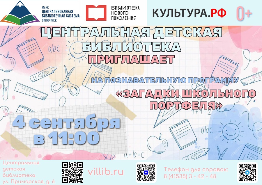 4 сентября в 11:00 в Центральной детской библиотеке состоится праздничная программа «Загадки школьного портфеля», посвященная началу нового учебного года. Участников ждет встреча с любимыми героями книг и сказок, с которыми можно повеселиться, отгадать загадки о школе и школьных принадлежностях, поучаствовать в викторине и помочь первокласснику собраться в школу. Мероприятие рассчитано на детей от 6 до 10 лет и родителей. Адрес Центральной детской библиотеки: ул. Приморская, 6, 1-й этаж. ☎ для справок: 8 (415-35) 3-42-48.