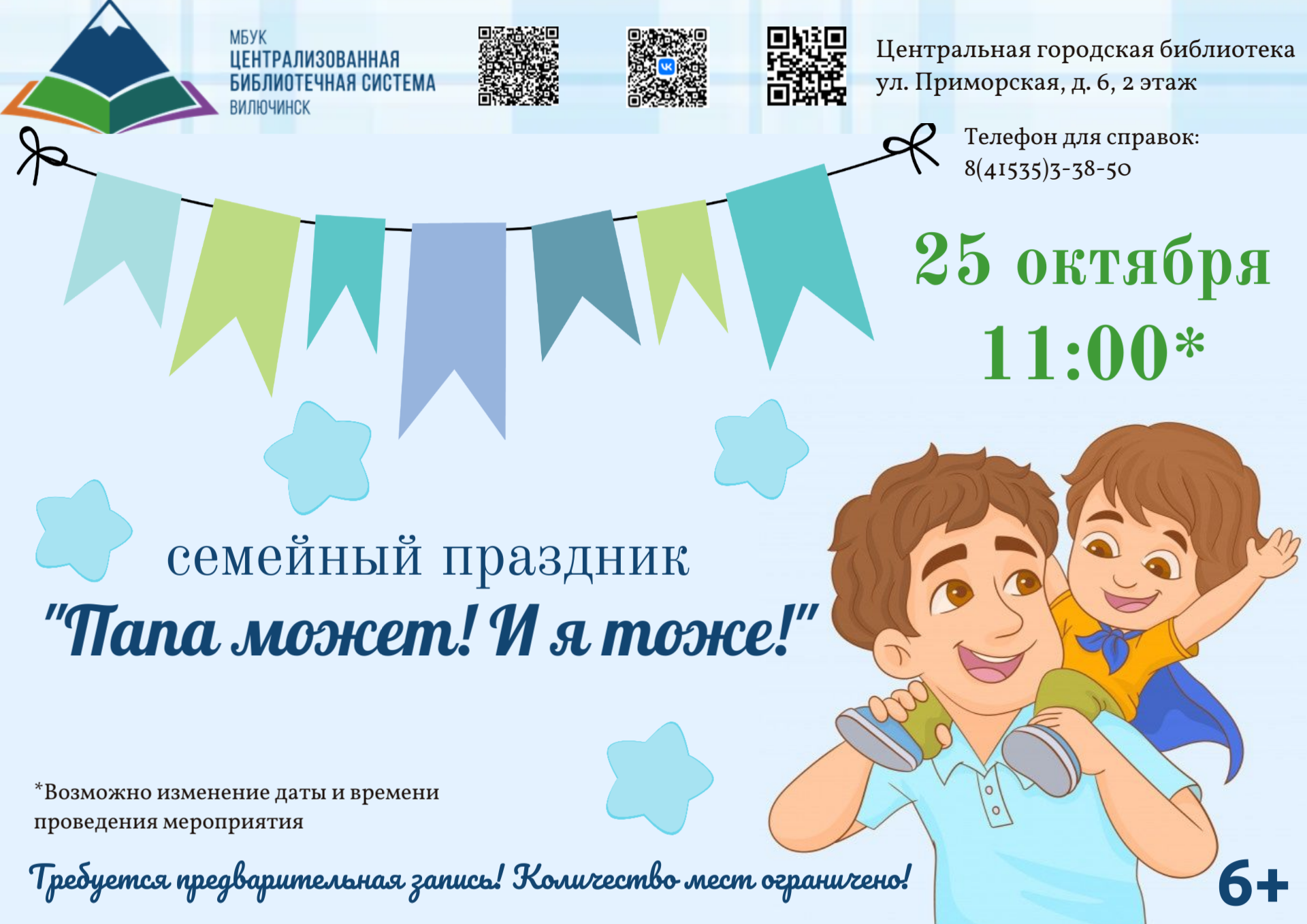 25 октября в 11:00 сотрудники Центральной городской библиотеки приглашают пап и их детей принять участие в семейном празднике «Папа может, и я тоже!», посвященном Дню отца. Организаторы подготовили интересные испытания, которые помогут укрепить семейные узы и подарят море положительных эмоций. Вас ждут: весёлые соревнования между папами и детьми, оригинальные творческие задания, игры на сплочение и забавные конкурсы. Дети покажут, как они научились помогать по дому, а папы поделятся своими секретами мастерства. Требуется предварительная запись! Количество мест ограничено! Возможно изменение даты и времени проведения мероприятия. Мероприятие состоится в Центральной городской библиотеке по адресу: ул. Приморская, 6, 2-й этаж. ☎ для справок: 8 (415-35) 3-38-50