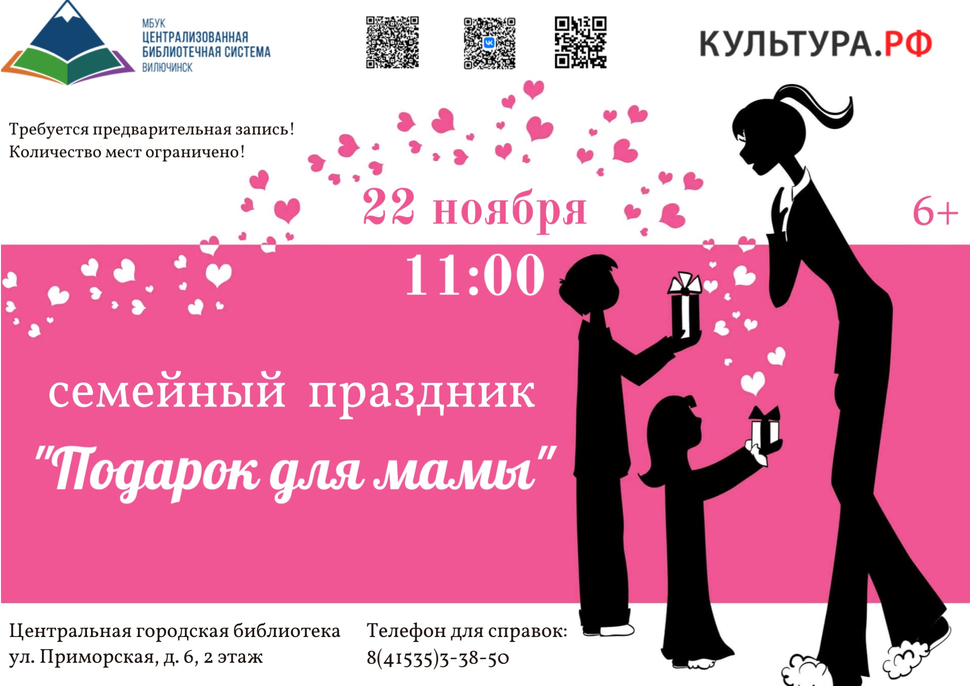 Что могут подарить дети своим мамам на День матери? Сделанную с любовью открытку? Трогательный рисунок? Или, быть может, самое ценное – своё хорошее поведение? 22 ноября в 11:00 в Центральной городской библиотеке для мам и их детей пройдет семейный праздник «Подарок для мамы». В программе — весёлые конкурсы, которые объединят семьи в общем веселье, и подвижные игры, дарящие заряд бодрости и положительных эмоций. Дети не только примут участие в увлекательных состязаниях, но и откроют для себя множество новых способов порадовать свою маму. А мамы на протяжении всего праздника будут в центре внимания: их ждут приятные сюрпризы и, конечно же, подарки! Требуется запись! Количество мест ограничено! Адрес Центральной городской библиотеки: ул. Приморская, 6, 2-й этаж. Актуальная программа мероприятий библиотек города доступна в разделе «Афиши» | |