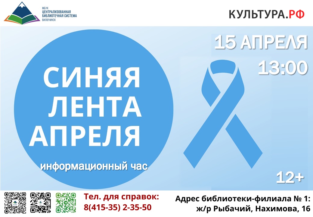 15 апреля в 13:00 в библиотеке-филиале № 1 состоится информационный час под названием «Синяя лента апреля», целью которого является привлечение внимания общественности к проблемам жестокого обращения с детьми. В разных странах мира апрель отмечается как месяц борьбы против насилия над детьми. Символом этой борьбы стала синяя лента – её цвет символизирует следы от ушибов на теле ребёнка. Повязав её на руку или одежду, каждый становится участником акции, показывая пример недопустимости жестокого обращения с детьми. В это время проводятся мероприятия, направленные на защиту детей от насилия. На встрече в библиотеке участники узнают о проблемах насилия в обществе и о том, как предотвратить жестокое обращение с детьми в семье. Библиотекари познакомят присутствующих с примерами позитивных образцов культуры семейных отношений, основанных на партнёрстве и отказе от насильственных методов общения. Адрес библиотеки-филиала № 1: ул. Нахимова 16, 2 этаж. ☎ для справок: 8 (415-35) 2-35-50.