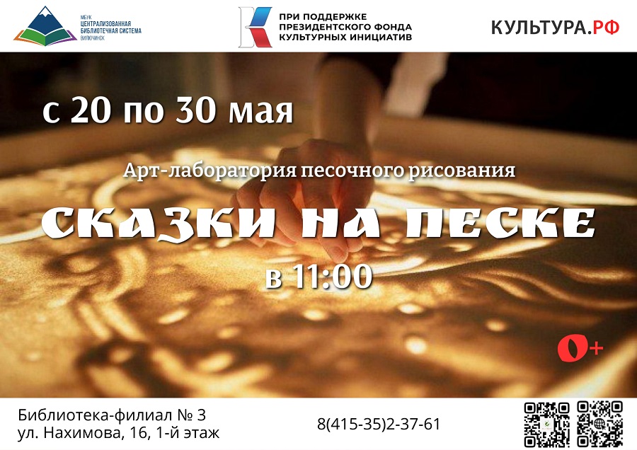 С 20 по 30 мая ежедневно в 11:00 библиотека-филиал № 3 приглашает детей на занятия в оборудованной студии песочного рисования. С помощью ведущей участники мероприятий смогут овладеть основами рисования на световых столах, освоят приемы и формы работы с песком и научатся простым играм. Рисование на песке способствует не только развитию творческих способностей и воображения ребёнка, но и снимает психологическое напряжение, снижает уровень стресса. Мероприятия организованы в рамках проекта «Сказочные БИБЛИОканикулы – сказки на все времена!» при поддержке Президентского фонда культурных инициатив. Адрес библиотеки-филиала № 3: ул. Нахимова, 16, 1 этаж. ☎ для справок: 8(415-35)2-37-61.