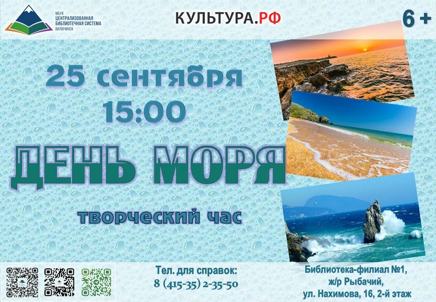 25 сентября в 15:00 в библиотеке-филиале № 1 состоится творческий час «День моря». Закончилось лето, пришла осень, но это не повод для уныния. Для рисования хорош любой день, даже осенний пасмурный. Библиотека приглашает всех желающих нарисовать акварелью воспоминания о море. В ходе мероприятия участники познакомятся с основными приёмами акварельной живописи и создадут полные жизни работы о водной стихии. Приглашаются все любители рисования. Мероприятие будет особенно полезно тем, кто интересуется акварельной техникой. Адрес библиотеки-филиала № 1: ул. Нахимова, 16, 2-й этаж. ☎ для справок: 8(415-35)2-35-50.