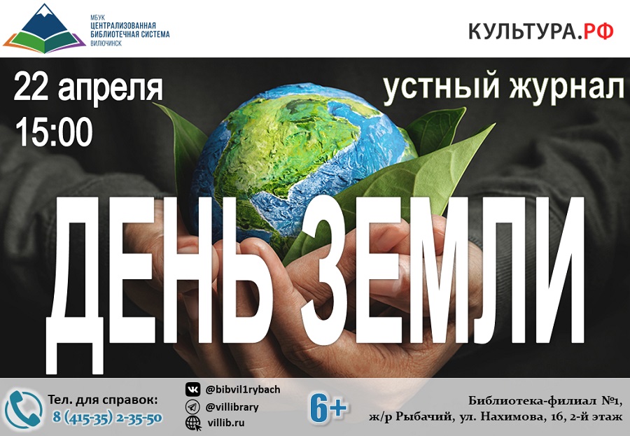22 апреля в 15:00 библиотека-филиал № 1 приглашает школьников на устный журнал «День Земли», посвящённый международной акции по привлечению внимания общества к экологическим проблемам. Праздник, который ежегодно отмечается 22 апреля, не просто сближает жителей нашей планеты, но и призывает напомнить каждому человеку, что он является частицей единого живого организма. Сотрудники библиотеки познакомят участников с историей праздника, расскажут о красоте, природных богатствах и экологии планеты Земля. В ходе мероприятия ребята узнают, какую роль играет человек в охране природы и познакомятся с экологическими проблемами, возникшими по вине человечества. Адрес библиотеки-филиала № 1:, ул. Нахимова,16, 2 этаж. ☎ для справок: 8 (415-35) 2-35-50.