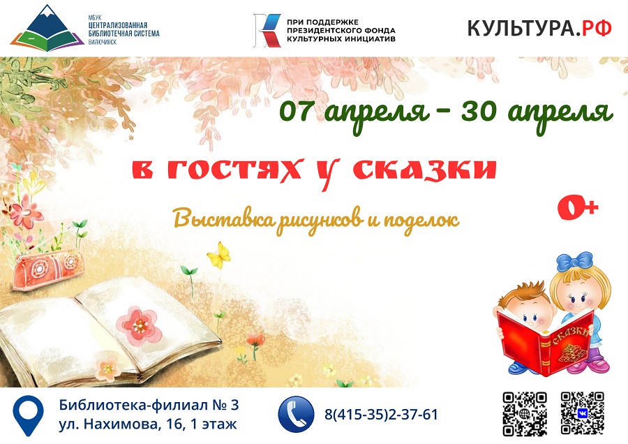С 7 по 30 апреля детская библиотека-филиал № 3 приглашает посетить выставку «В гостях у сказки» с рисунками и поделками детей – участников проекта «Сказочные БИБЛИОканикулы – сказки на все времена!» В ходе реализации проекта более 100 детей младшего школьного возраста участвовали в мастер-классах по сказкам разных народов России: рисовали сказочных героев, осваивали национальные орнаменты и узоры, знакомились с техникой изготовления народных кукол, игрушек и оберегов. Выставка представляет итог всей проделанной детьми и командой проекта работы. Проект «Сказочные БИБЛИОканикулы – сказки на все времена!» реализуется при поддержке Президентского фонда культурных инициатив. Адрес библиотеки-филиала № 3: ул. Нахимова, 16, 1 этаж. ☎ для справок: 8 (415-35) 2-37-61.