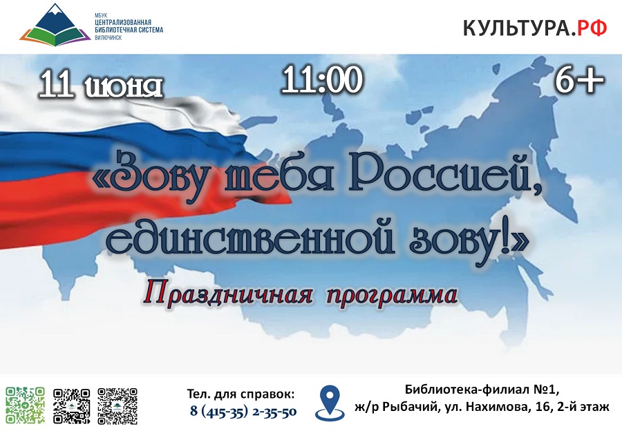 11 июня в 11:00 библиотека-филиал № 1 приглашает жителей Вилючинска на праздничную программу «Зову тебя Россией, единственной зову!», посвящённую Дню России. В ходе мероприятия участники узнают об истории возникновения праздника, великих страницах истории России и людях, которые её создавали. Ведущая расскажет о символах России: истории появления государственного гимна, происхождении двуглавого орла, значении цветов российского флага. Также все желающие смогут принять участие в викторине, которая обогатит знания гостей о традициях, истории и культуре России, национальной кухне, одежде и пословицах. Адрес библиотеки-филиала № 1: ул. Нахимова, 16, 2-й этаж. ☎ для справок: 8 (415-35) 2-35-50.