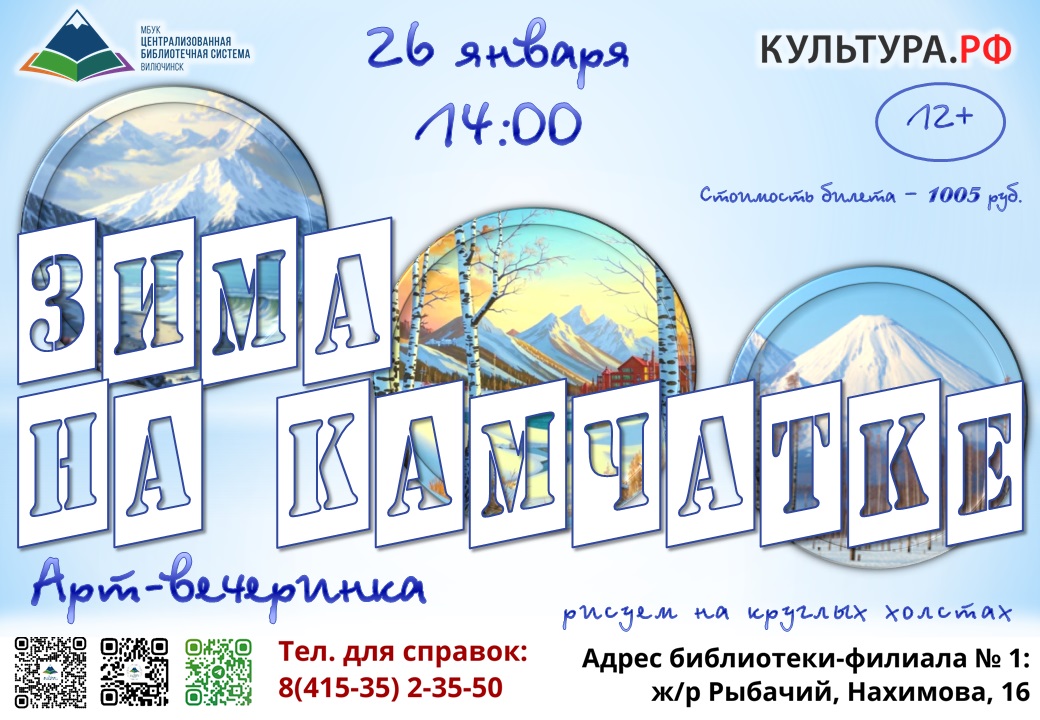 26 января в 14:00 библиотека-филиал № 1 приглашает всех желающих принять участие в арт-встрече «Зима на Камчатке». Участники нарисуют зимние пейзажи на круглых холстах. Арт-встреча – увлекательное мероприятие, позволяющее не только окунуться в творчество, но и погрузиться в мир удивительных природных явлений Камчатского края и познакомиться с единомышленниками. Под руководством библиотекаря все гости библиотеки смогут развить свой творческий потенциал и окунуться в волшебный мир красок, холстов и кистей. Каждая созданная картина станет отражением красоты и уникальности Камчатки. Стоимость билета – 1 005 руб. Адрес библиотеки-филиала № 1: ул. Нахимова 16, 2 этаж. ☎ для справок: 8 (415-35) 2-35-50.