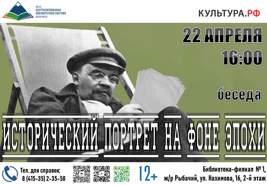 22 апреля в 16:00 библиотека-филиал № 1 приглашает всех желающих на беседу «Исторический портрет на фоне эпохи», посвящённую155-летию со дня рождения революционера, переводчика, экономиста, теоретика марксизма, советского политического и государственного деятеля – Владимира Ильича Ленина, оставившего заметный след в истории России. Имя Владимира Ильича Ленина прочно вошло в историю ХХ века, а его деятельность во многом определила ход мирового развития. Во время Великой Октябрьской социалистической революции 1917 года был совершён государственный переворот, к власти пришли большевики и В.И. Ульянов-Ленин стал создателем и руководителем молодого советского государства. Адрес библиотеки-филиала № 1: ул. Нахимова, 16, 2 этаж. ☎ для справок: 8(415-35)2-35-50.
