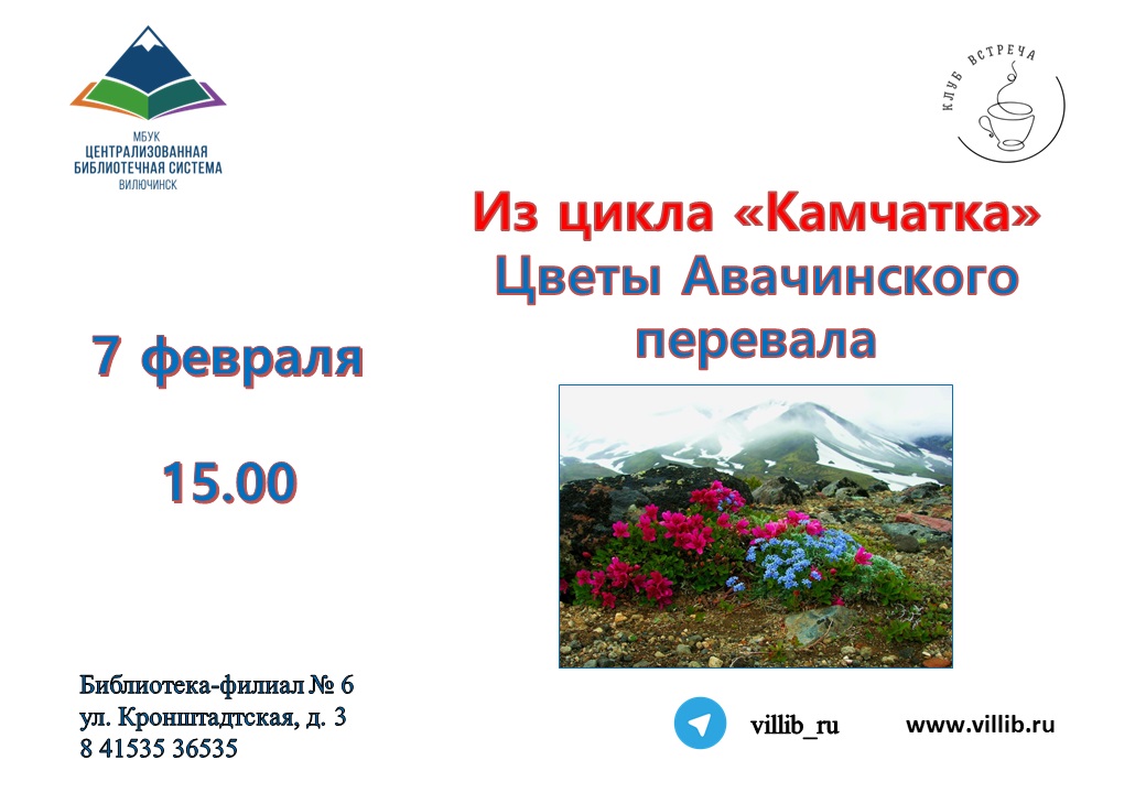 07 февраля в 15:00 в библиотеке-филиале № 6 состоится очередное заседание библиотечного клуба «Встреча». Темой мероприятия станет краеведение. В рамках цикла «Камчатка» состоится встреча с Борисом Васильевичем Паруновым – натуралистом-любителем и путешественником по Камчатке. Разговор пойдет о цветах, работе и цветочных экскурсиях в районе Авачинского перевала. В мероприятии могут принять участие все желающие. Адрес библиотеки-филиала № 6: ул. Кронштадтская, 3. ☎ для справок: 8(415-35)3-13-63.