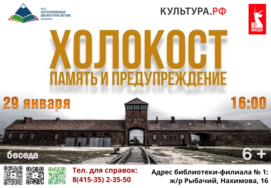 29 января в 16:00* часов в библиотеке-филиале № 1 состоится беседа «Холокост: память и предупреждение». Изучение военного прошлого – это не только сохранение памяти о погибших, но и одно из условий выживания современного человека. 27 января – Международный день памяти жертв Холокоста. Сотрудники библиотеки расскажут о преднамеренном массовом уничтожении миллионов невинных жертв в годы Второй мировой войны. О том, как движимые расистской идеологией нацисты осуществили геноцид в беспрецедентных масштабах, создав хорошо отлаженную систему по уничтожению людей, которая почти никогда не давала сбоев. Участникам мероприятия будут представлены фото- и видео-хроники о функционировании гетто и концентрационных лагерей. Холокост по праву называют одним из самых чудовищных и непростительных преступлений, которые когда-либо были совершены в истории человечества. *Возможно изменение времени проведения мероприятия. Адрес библиотеки-филиала № 1: ул. Нахимова 16, 2 этаж. ☎ для справок: 8 (415-35) 2-35-50.
