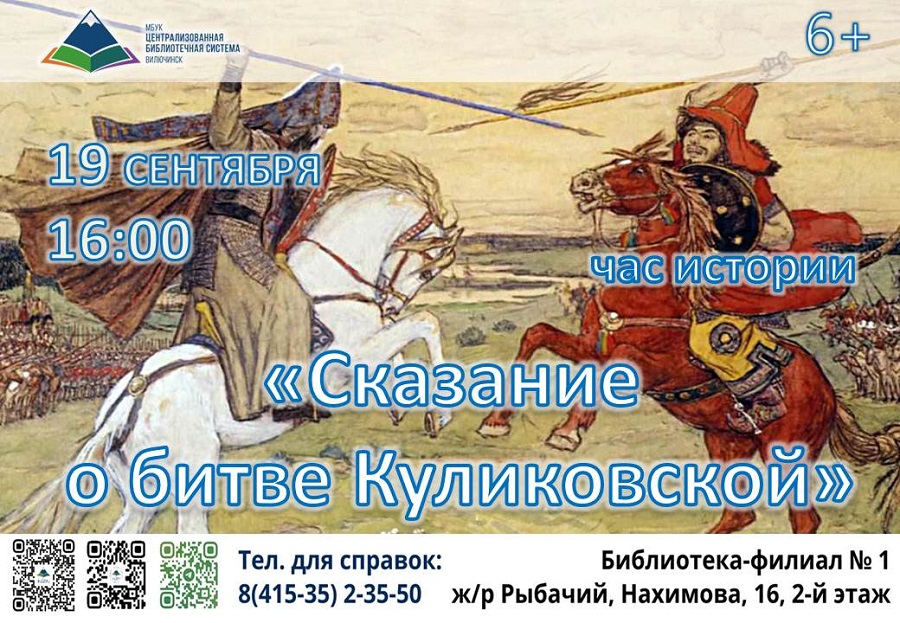 19 сентября в 16:00 в библиотеке-филиале № 1 состоится час истории «Сказание о битве Куликовской». Библиотекари расскажут о сражении 1380 года, произошедшем на Куликовом поле, где Непрядва впадает в Дон. В рамках мероприятия посетители смогут познакомиться с историческими фактами, связанными с этой знаменитой битвой. Также для гостей библиотеки будет подготовлена книжная выставка, посвящённой Куликовской битве. На ней будут представлены книги различных жанров: от исторической хроники до художественной литературы. Мероприятие подойдет для всех любителей истории России. Адрес библиотеки-филиала № 1: ул. Нахимова, 16, 2-й этаж. ☎ для справок: 8(415-35)2-35-50.