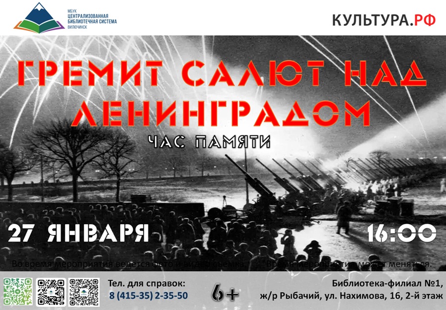 27 января в 16:00 в библиотеке-филиале № 1 состоится час памяти «Гремит салют над Ленинградом», посвящённый годовщине прорыва блокады Ленинграда. Приглашаем всех желающих отдать дань уважения подвигу ленинградцев и вновь пережить ключевые моменты той героической эпохи. Мероприятие – возможность прикоснуться к истории города, который, несмотря на нечеловеческие испытания, не сдался и выстоял. В ходе мероприятия вы:
