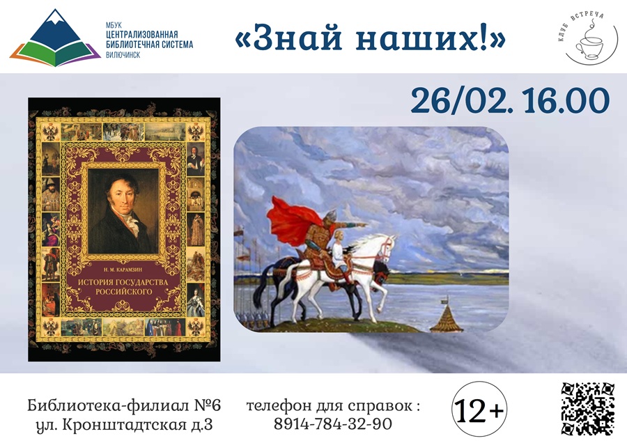 26 февраля в 16:00 библиотека филиал № 6 приглашает на заседание клуба «Встреча». Участники погрузятся в историю российского государства: рассмотрят правителей Руси по одноимённой книге Николая Карамзина. Первое слово – о великом князе Киевской Руси Олеге. Ждём всех, кто интересуется отечественной историей! Адрес библиотека-филиал №6: ул. Кронштадтская, 3.