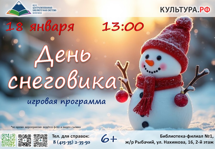 Не пропустите самый снежный праздник зимы! Приходите, будет жарко – даже в морозный день! Адрес библиотеки-филиала № 1: ул. Нахимова, 16, 2-й этаж. ☎ для справок: 8(415-35)2-35-50.
