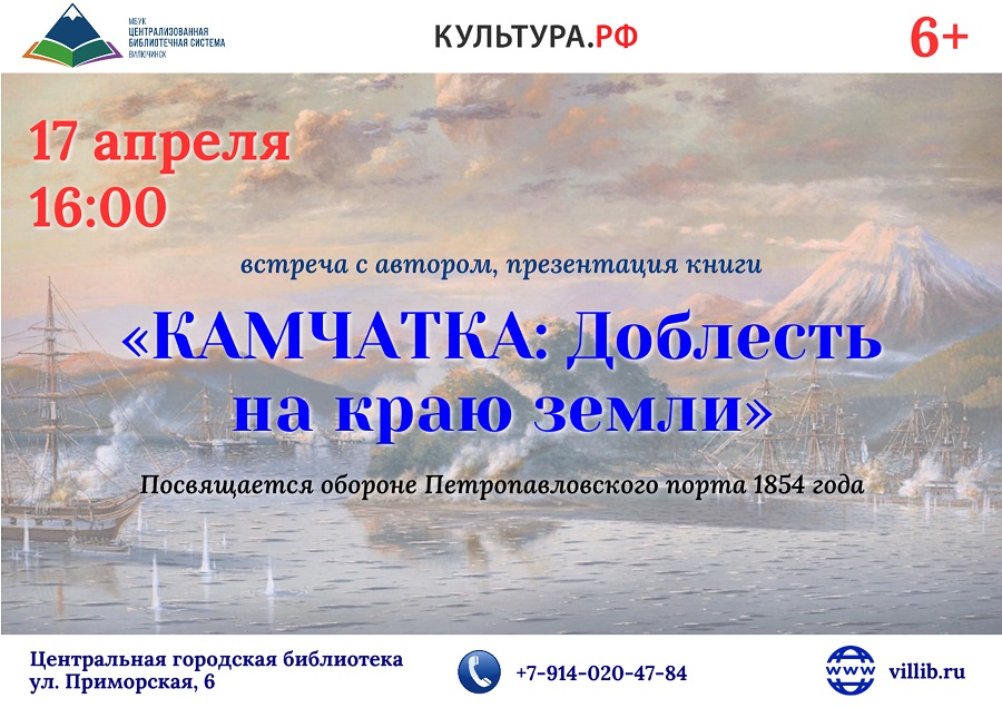 17 апреля в 16:00 в Центральной городской библиотеке состоится встреча с писателем Сергеем Пермяковым и презентация его книги «Камчатка: Доблесть на краю земли». Сергей Пермяков – наш земляк, родился и вырос на Камчатке. С детства интересовался историей и уже к окончанию школы решил написать книгу, посвящённую героической обороне Петропавловского порта во время Крымской войны 1853 – 1856 гг. Будущий автор хотел, чтобы эта книга была яркой, интересной и доступной детям и взрослым. На встрече с жителями Вилючинска Сергей расскажет о себе, о работе над книгой и ответит на вопросы участников мероприятия. Вход свободный, приглашаются все желающие. Адрес Центральной городской библиотеки: ул. Приморская, 6, 2 этаж. ☎ для справок: 8 (41535) 3-38-50.