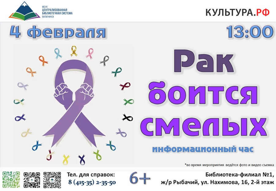 4 февраля в 13:00 в библиотеке-филиале № 1 состоится информационный час «Рак боится смелых», приуроченный ко Всемирному дню борьбы против рака. Библиотекари приглашают всех неравнодушных к вопросам здоровья на познавательное мероприятие, где каждый сможет узнать о современных подходах к профилактике онкологических заболеваний, ранних признаках, методах диагностики и важности своевременного обращения к врачу. Наша цель – развеять мифы, повысить осведомлённость и поддержать культуру заботы о собственном здоровье. В программе информационного часа: