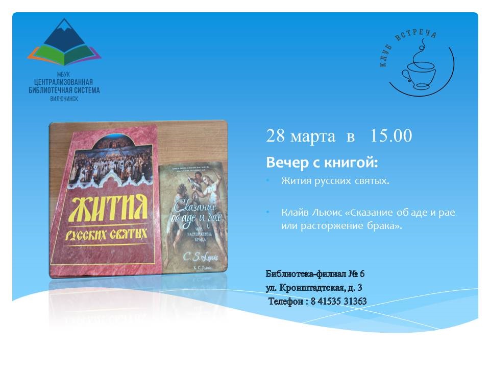 28 марта в 15:00 в библиотеке-филиале № 6 состоится очередное заседание библиотечного клуба «Встреча». В рамках цикла «Вечер с книгой» разговор пойдёт о книгах. Вплоть до начала XX века жития святых были любимым чтением русского народа. Своими впечатлениями о книге «Жития русских святых: месяцеслов» поделится одна из читательниц библиотеки. Библиотекарь Елена Юрьевна Романенко расскажет о книге Клайва Льюиса «Сказание об аде и рае, или Расторжение брака». Клайв Синклер Льюис известен как автор «Хроник Нарнии». Это один из самых читаемых христианских писателей. Его книги становятся поддержкой, помогают находить ответы на вечные вопросы. Одно из таких произведений – философская повесть «Расторжение брака» о путешествии героя из ада в преддверие рая, о невозможности соединения добра и зла. В мероприятии могут принять участие все желающие. Адрес библиотеки-филиала № 6: ул. Кронштадтская, 3. ☎ для справок: 8(415-35) 3-13-63.