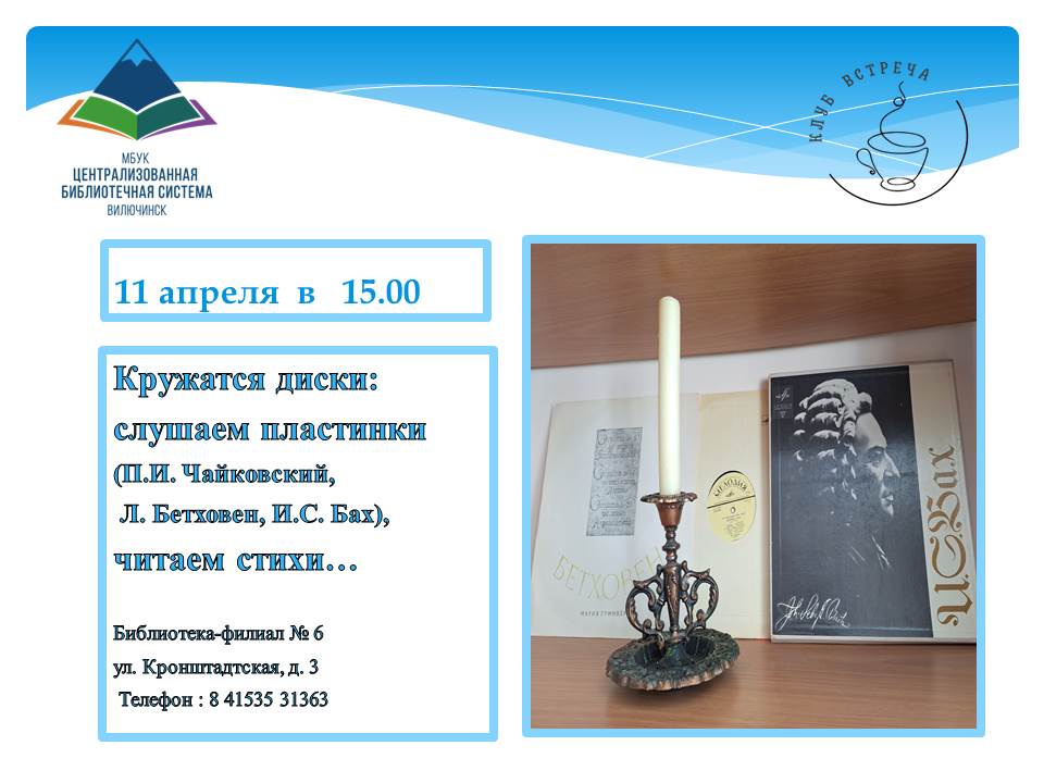 11 апреля в 15:00 в библиотеке-филиале № 6 состоится очередное заседание библиотечного клуба «Встреча». Идея встречи – в уютной обстановке послушать, как звучит классическая музыка на проигрывателе, прочитать любимые стихи. Для праздника нужно немного: красивый наряд, белая скатерть, свечи. Для радости – стихи и забытое звучание классической музыки из проигрывателя. В мероприятии могут принять участие все желающие. Адрес библиотеки-филиала № 6: ул. Кронштадтская, 3. ☎ для справок: 8(415-35) 3-13-63.