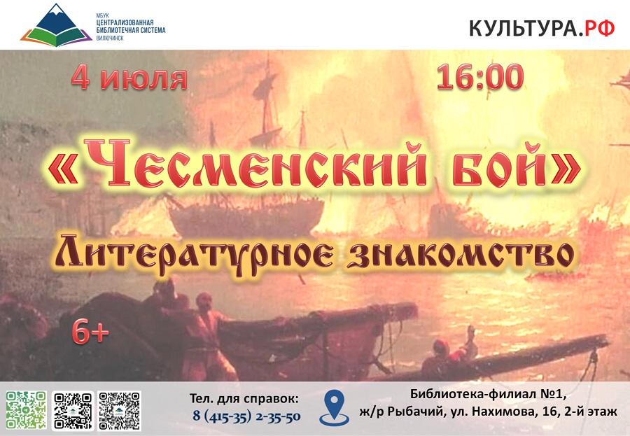 4 июля в 16:00 в библиотеке-филиале № 1 состоится литературное знакомство «Чесменский бой». Все желающие приглашаются на познавательное мероприятие, посвящённое Чесменскому бою, которое позволит погрузиться в историю одного из самых значимых морских сражений XVIII века. В ходе мероприятия ведущие расскажут участникам о решении военного совета, который принял смелое решение сжечь запертый турецкий флот. Гости узнают о подготовке брандеров – небольших судов, начинённых порохом, и о смелых командирах, которые рискнули своими жизнями ради победы. Узнают о роли Ивана Ганнибала, сына «арапа Петра Великого», и его команде, которые осуществили ночную атаку на турецкий флот. Все вместе участники обсудят, как эта победа, несмотря на численное превосходство врага, стала знаковым событием в истории русского флота. Адрес библиотеки-филиала № 1: ул. Нахимова, 16, 2 этаж. ☎ для справок: 8 (415-35)2-35-50.