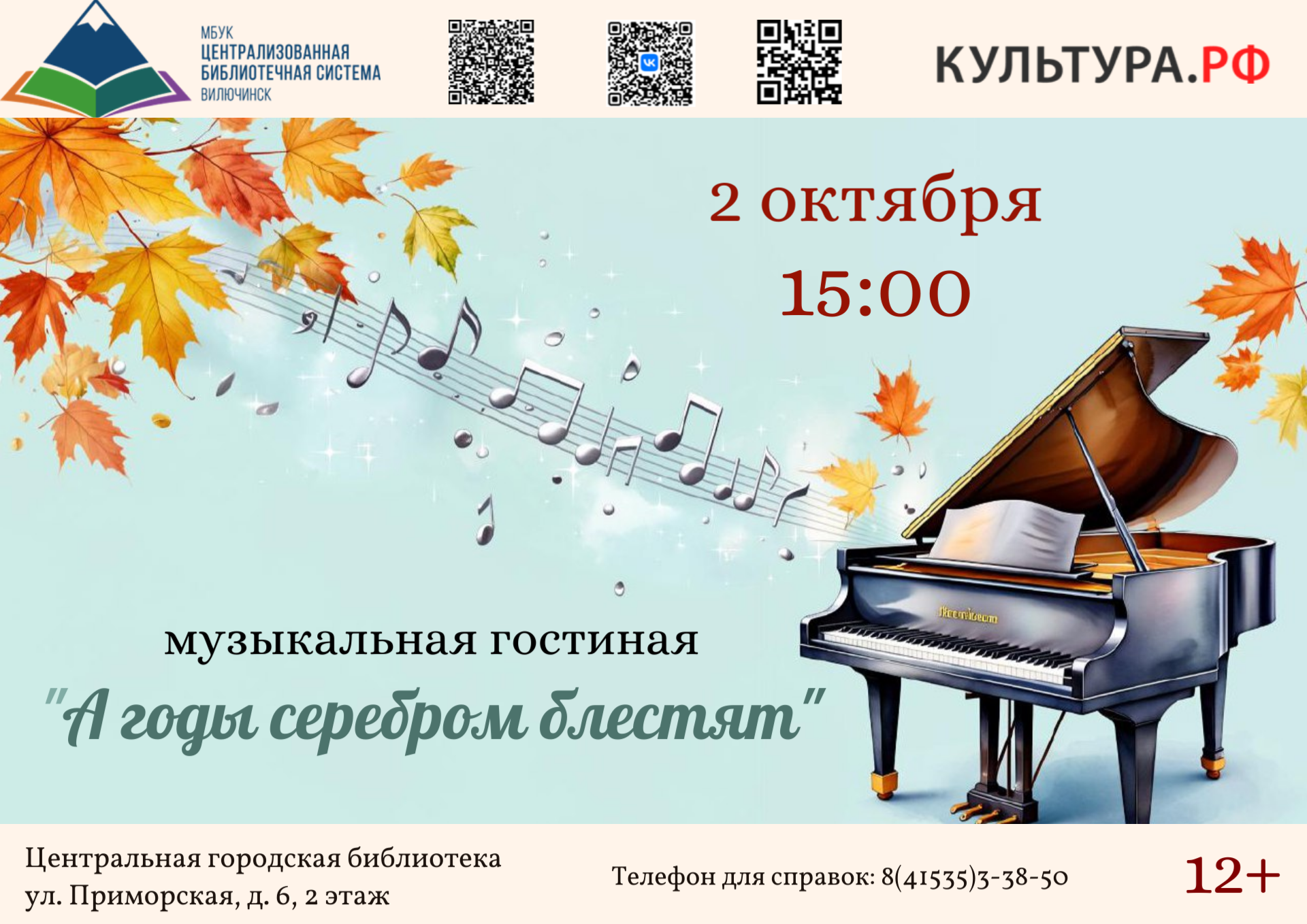 2 октября в 15:00 Центральная городская библиотека приглашает всех желающих на музыкальную гостиную «А годы серебром блестят». Каждый год в первых числах октября отмечается особенный праздник – Международный день пожилых людей. В этот день мы выражаем искреннюю благодарность и уважение старшему поколению, чьи жизненный опыт и мудрость являются жизненным ориентиром для подрастающего поколения. Бабушки и дедушки – хранители семейных традиций, наставники и наша опора. В программе вечера: тепло искренних улыбок, слова благодарности, музыка, атмосфера добра и безграничного вдохновения. Гостей ждёт удивительное путешествие в прошлое, связанное с жизнью и творчеством одного из самых выдающихся композиторов России. Адрес Центральной городской библиотеки: ул. Приморская, 6, 2-й этаж. Афиши актуальных мероприятий библиотек города смотрите в разделе «Анонсы» | |